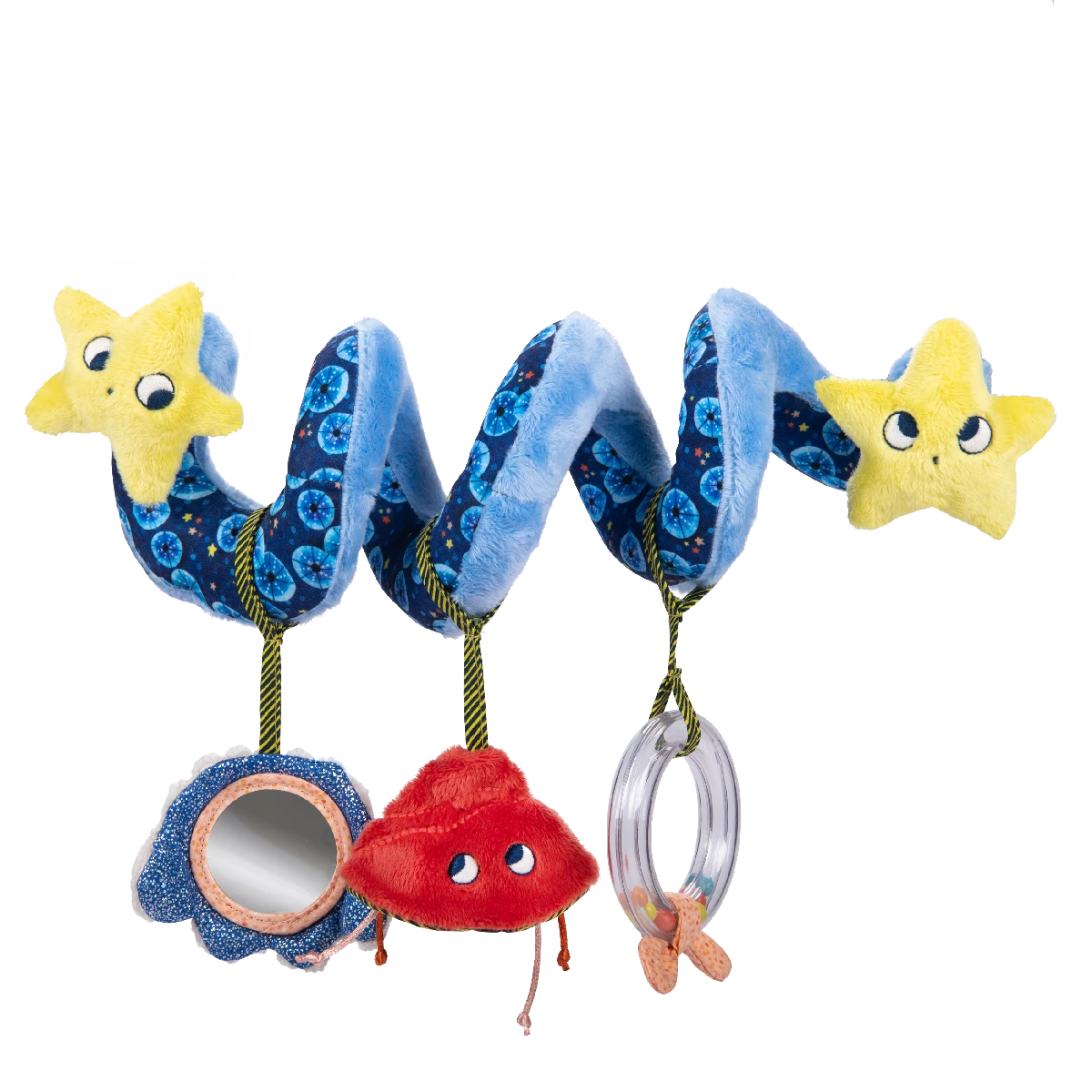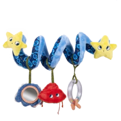 Spirale d’activités décorée d’animaux, de coquillages et plantes marines qui invite bébé à jouer sous l’océan : miroir, anneau à billes, étiquettes à saisir ou mâchouiller. Elle s’enroule facilement sur une poussette, un cosy ou un portique d’activités.