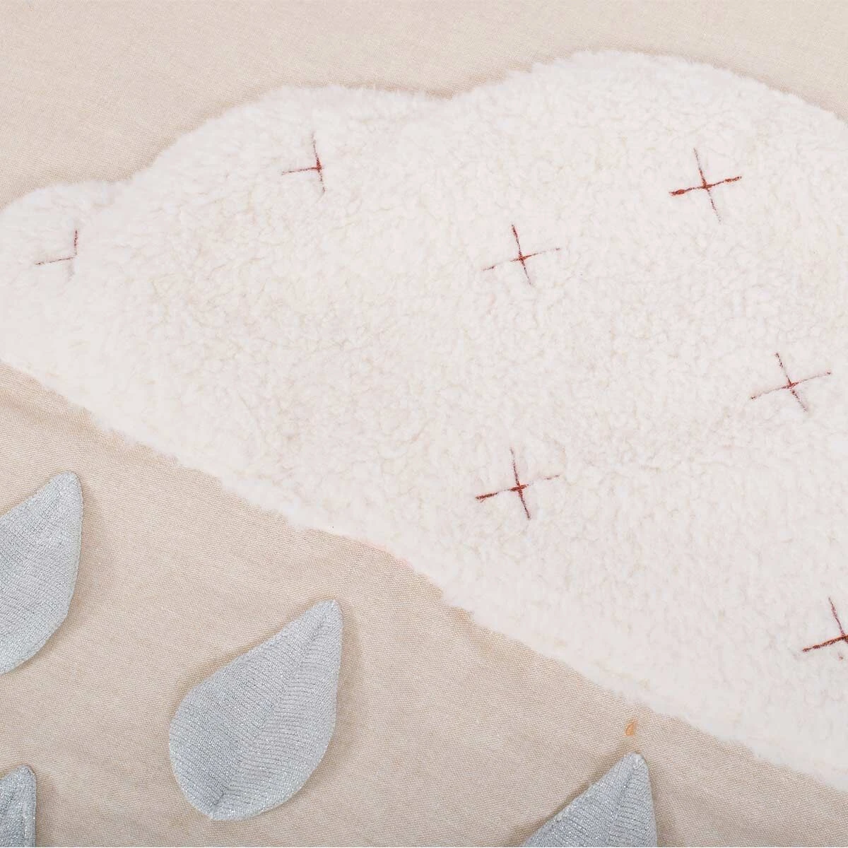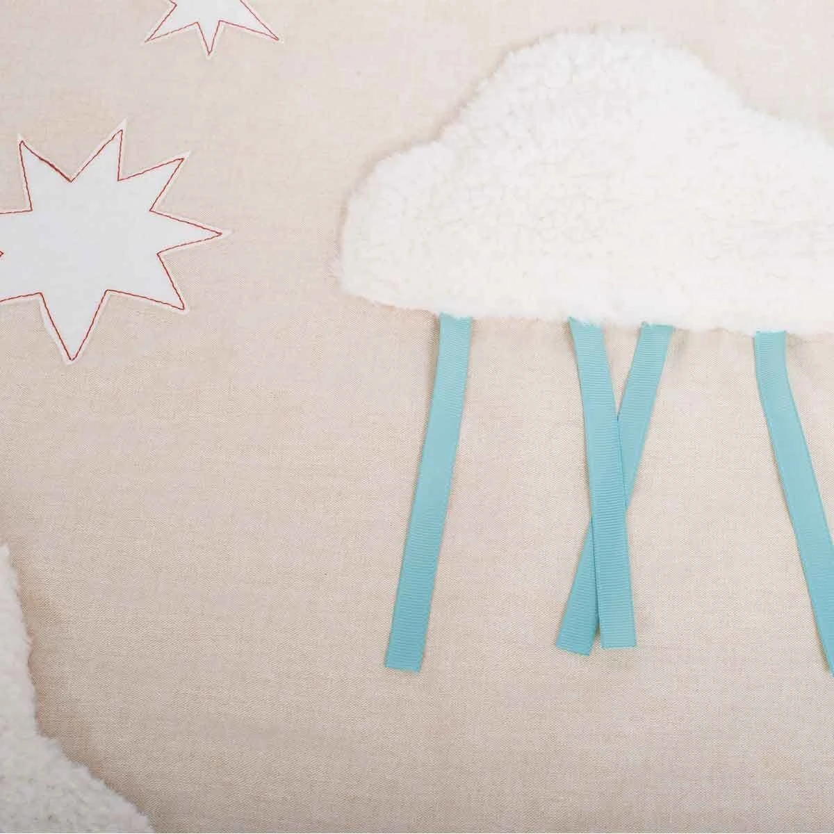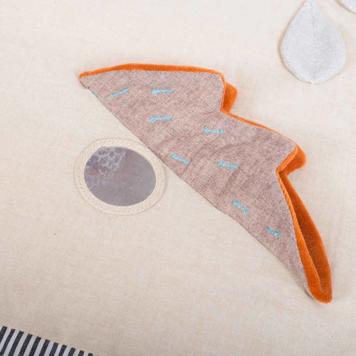 Tapis molletonné en tissu chambray avec de nombreuses activités aux couleurs d’automne. Des feuilles qui font scritch-scritch, un lapin à grelot dans sa tasse de thé, un anneau à billes caché dans la pomme et plein de matières à découvrir avec la météo !