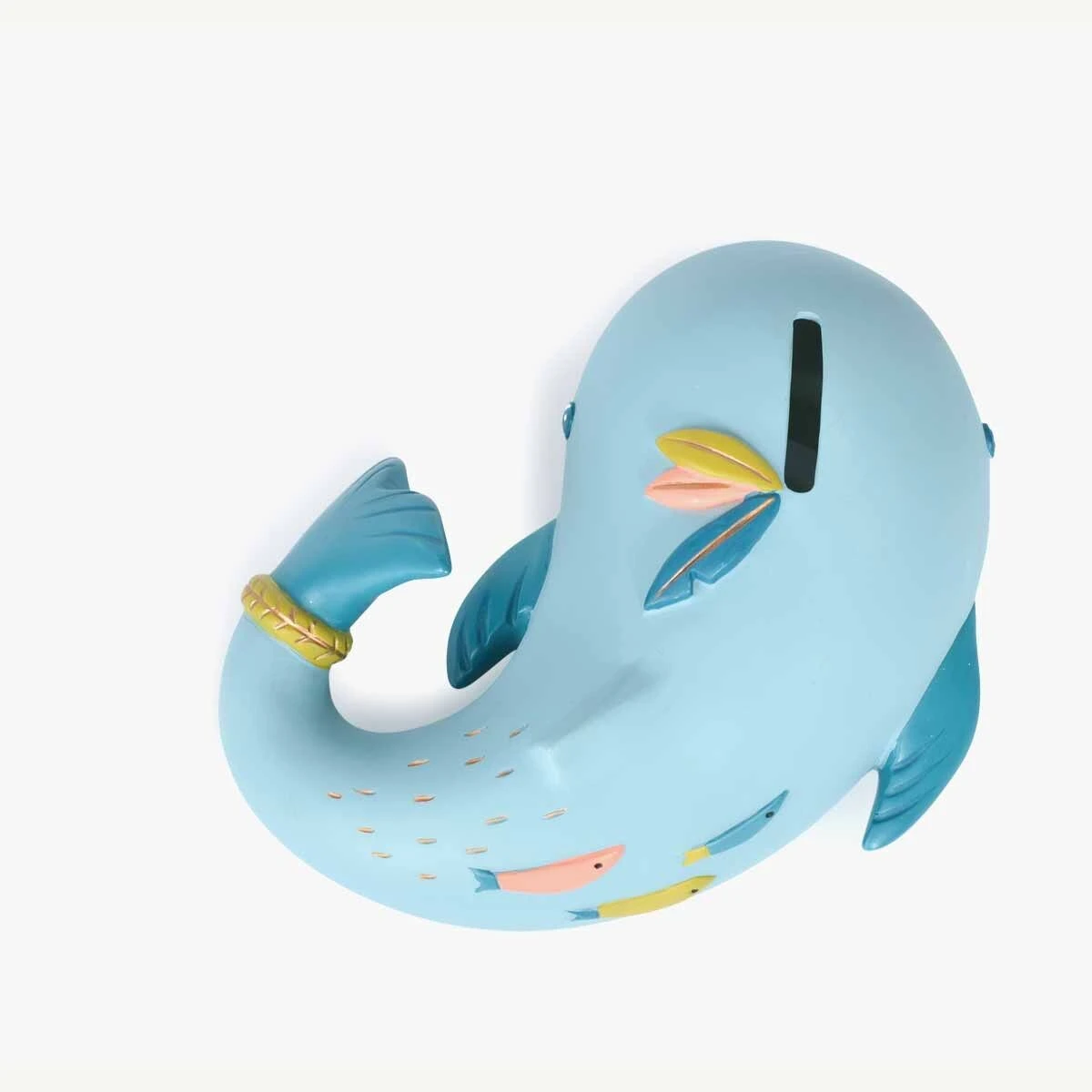 Tirelire baleine en résine, aux jolies nuances de bleu et de vert. Idéal comme objet de décoration et pour apporter une touche poétique et d’aventure dans une chambre d’enfant.