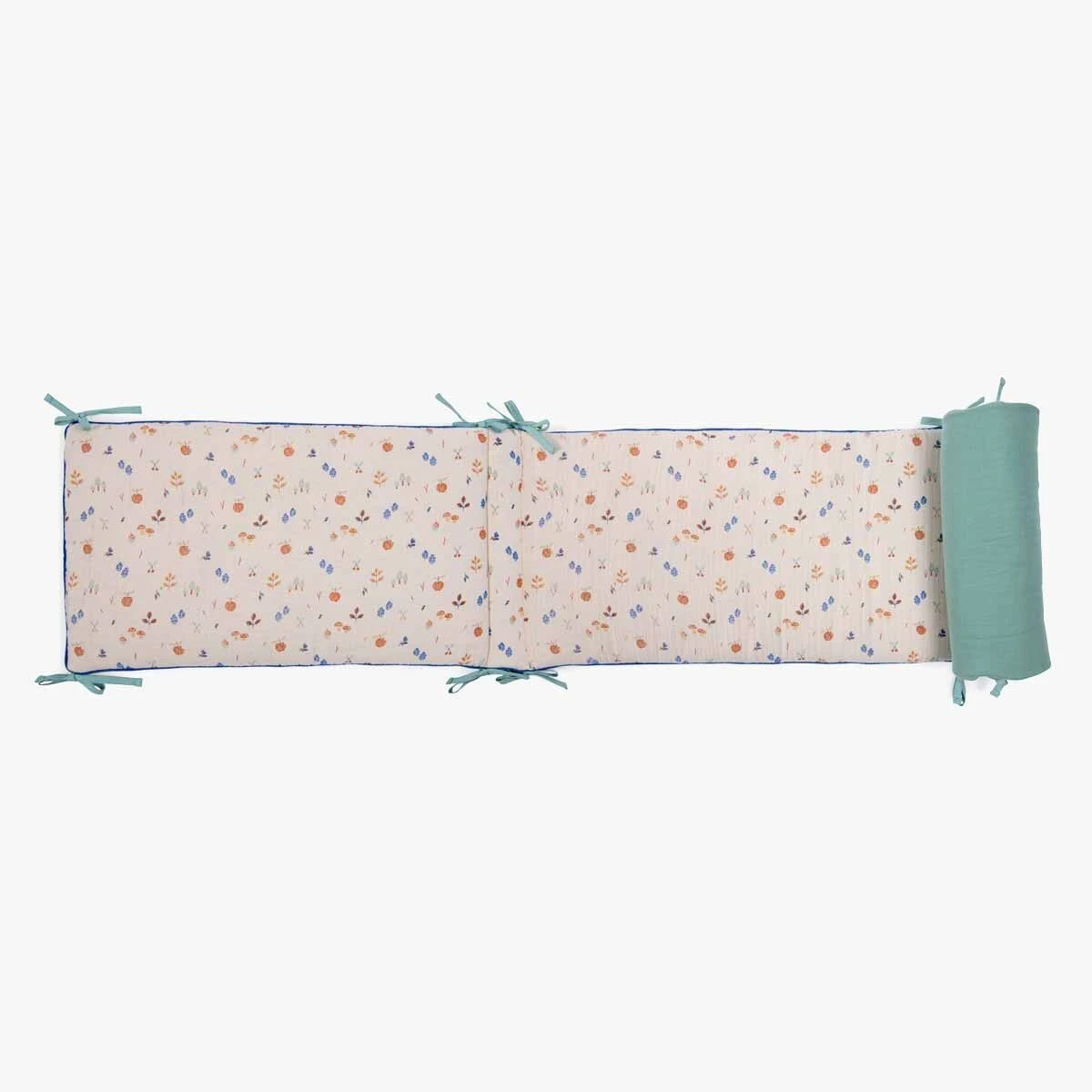 Pour entourer Bébé de douceur et décorer sa chambre : tissu 100% coton, certifié OEKO-TEX® avec imprimé cueillette d’un côté et uni vert sauge de l’autre. Un liseré contrasté bleu vient le sublimer. S’attache facilement tout autour du lit grâce à ses liens