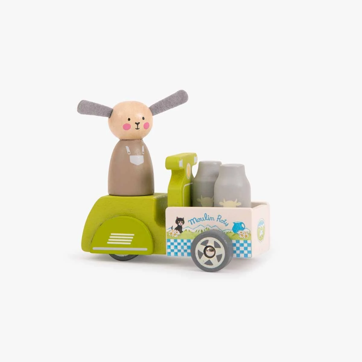 A l’aide de son triporteur, Albert le mouton va livrer son lait fraîchement recueilli à toute la Grande Famille. Tout en bois, l’ensemble comprend Albert et son triporteur chargé de 2 pots de lait.