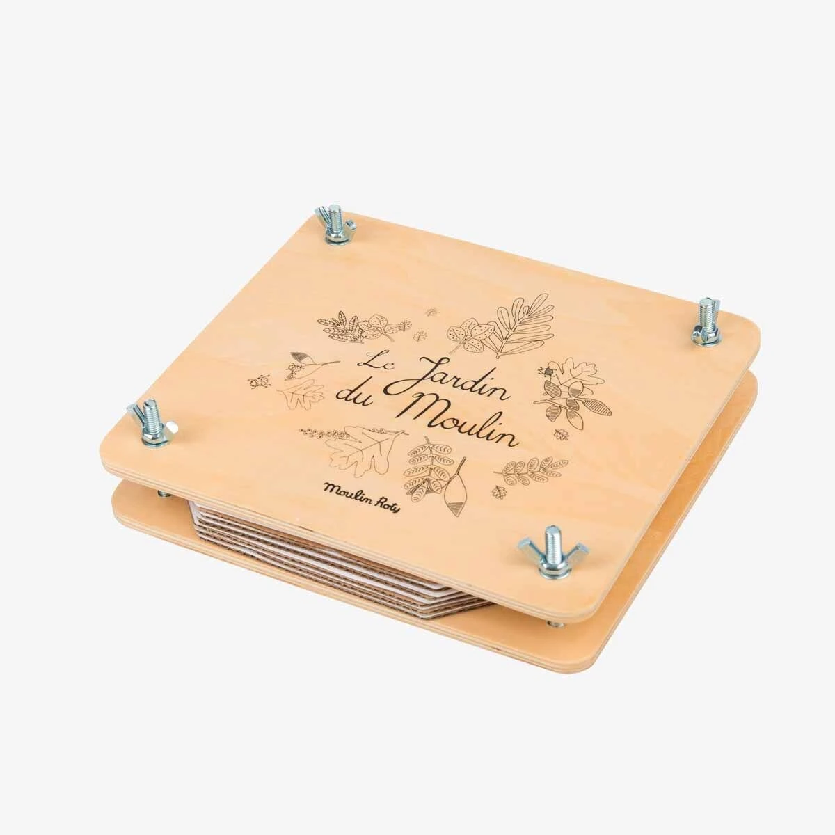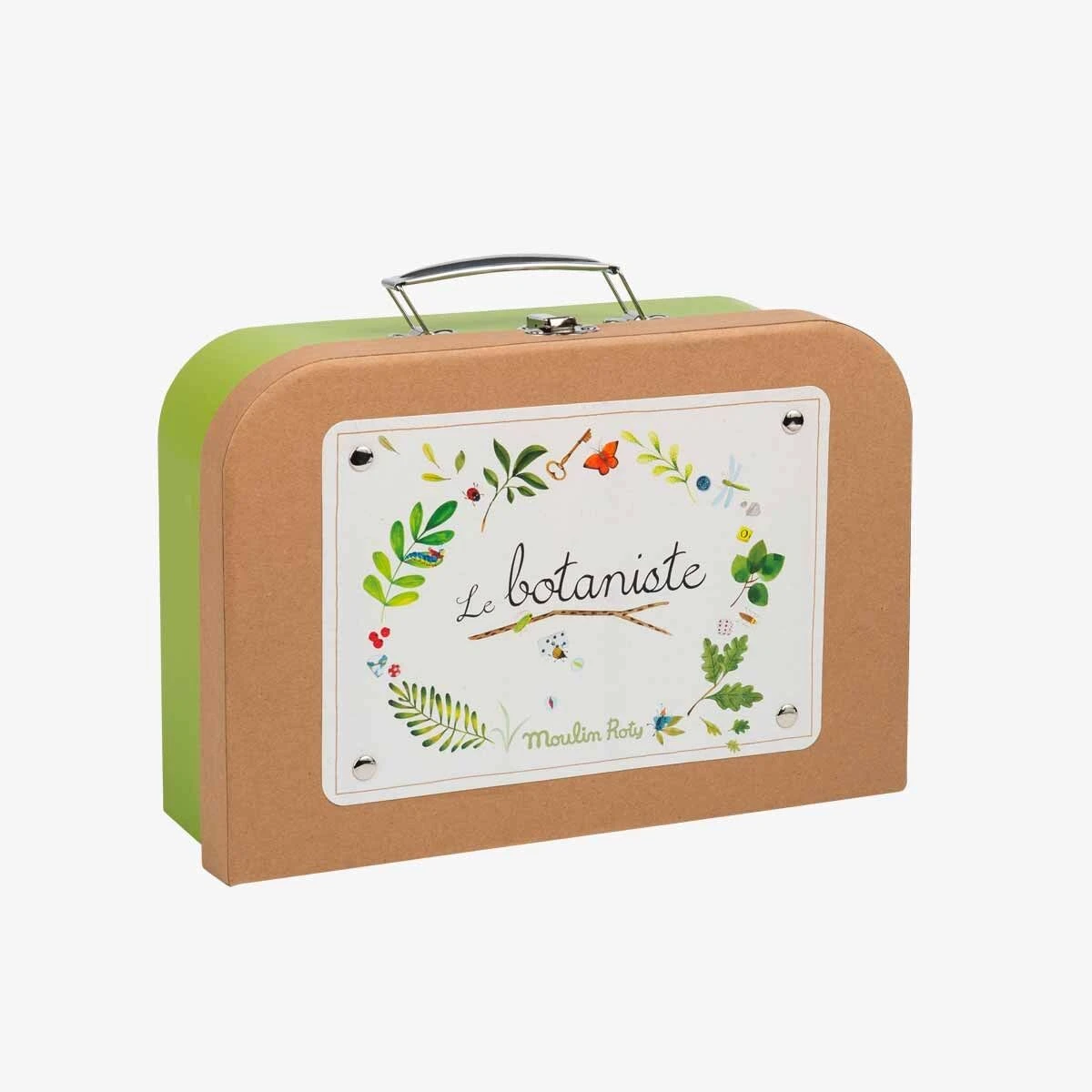 Valise du jeune botaniste contenant tous les ustensiles nécessaires pour observer la nature et faire sécher de jolies feuilles ou fleurs : une loupe, une presse à fleurs en bois, un carnet de note et 3 jolies boites illustrées pour y garder ses trésors.